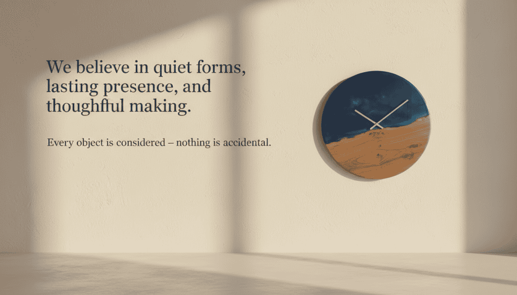 Objects designed to bring a calm, quiet presence into living spaces — from concrete and wood to epoxy, each Loravien clock is a study in form, texture, and shadow