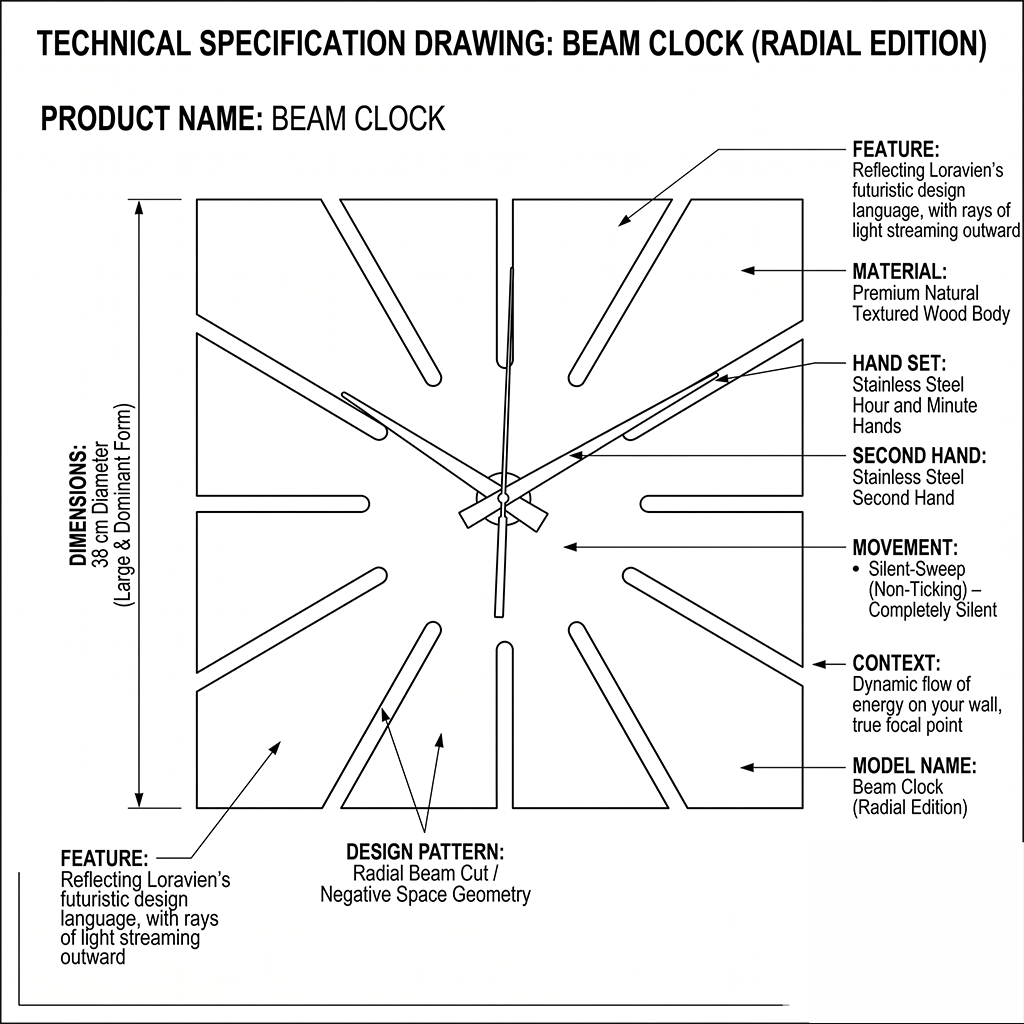 Reflecting Loravien’s futuristic design language, the Beam Clock takes its name from the rays of light streaming outward from its center. With its impressive 38 cm diameter, it is a true focal point that transforms time into a dynamic flow of energy on your wall.