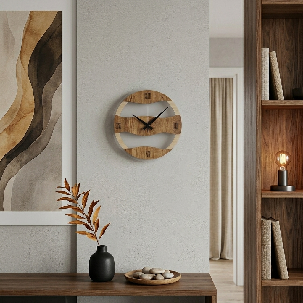 Current Clock | Wood & Plexiglass Series Inspired by the rhythm of nature, the Current Clock by Loravien takes its name from the continuous flow of time and water. Combining a wavy wood cut with the transparency of a modern plexiglass layer, this model adds dynamic elegance to your wall with its wide 38 cm form.