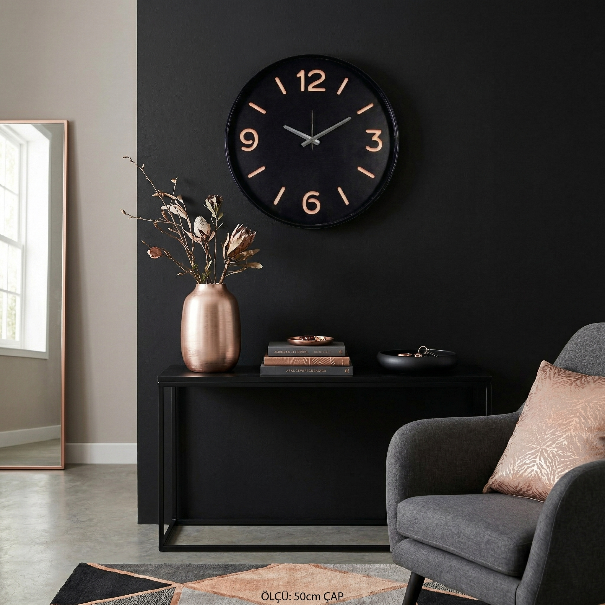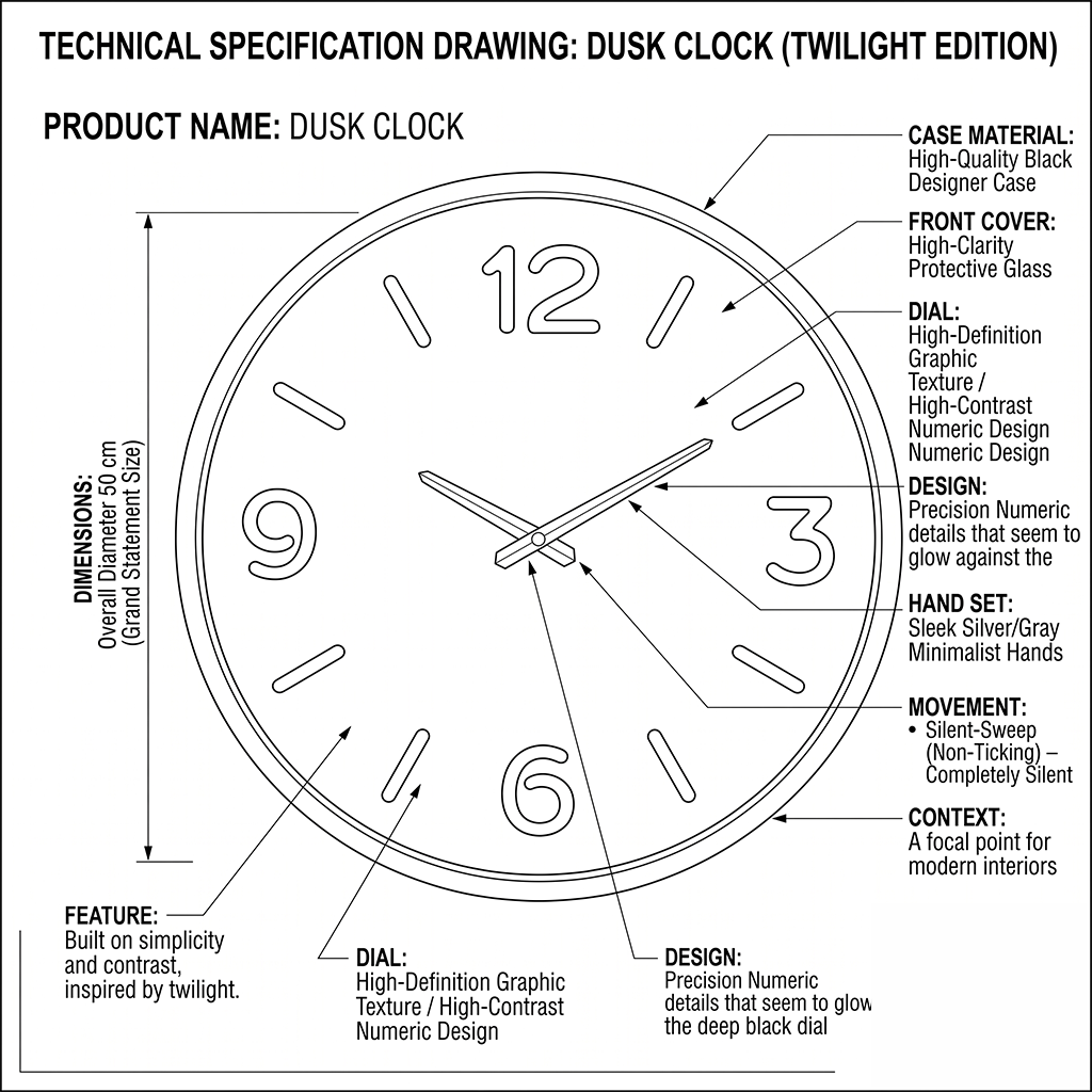 Dusk Clock | Large-Scale Modern Series Built on Loravien’s core principles of simplicity and contrast, the Dusk Clock draws its inspiration from twilight—the most peaceful moment of the day. With its impressive 50 cm diameter, numeric details that seem to glow against the deep black dial, and a protective glass front, it is the perfect focal point for modern interiors.