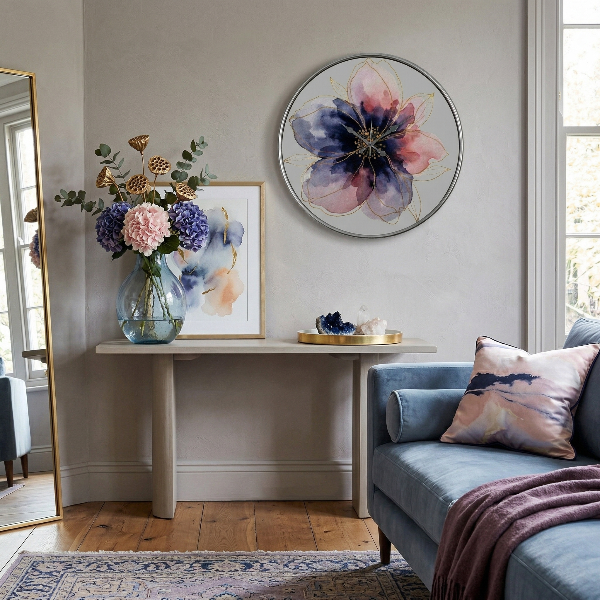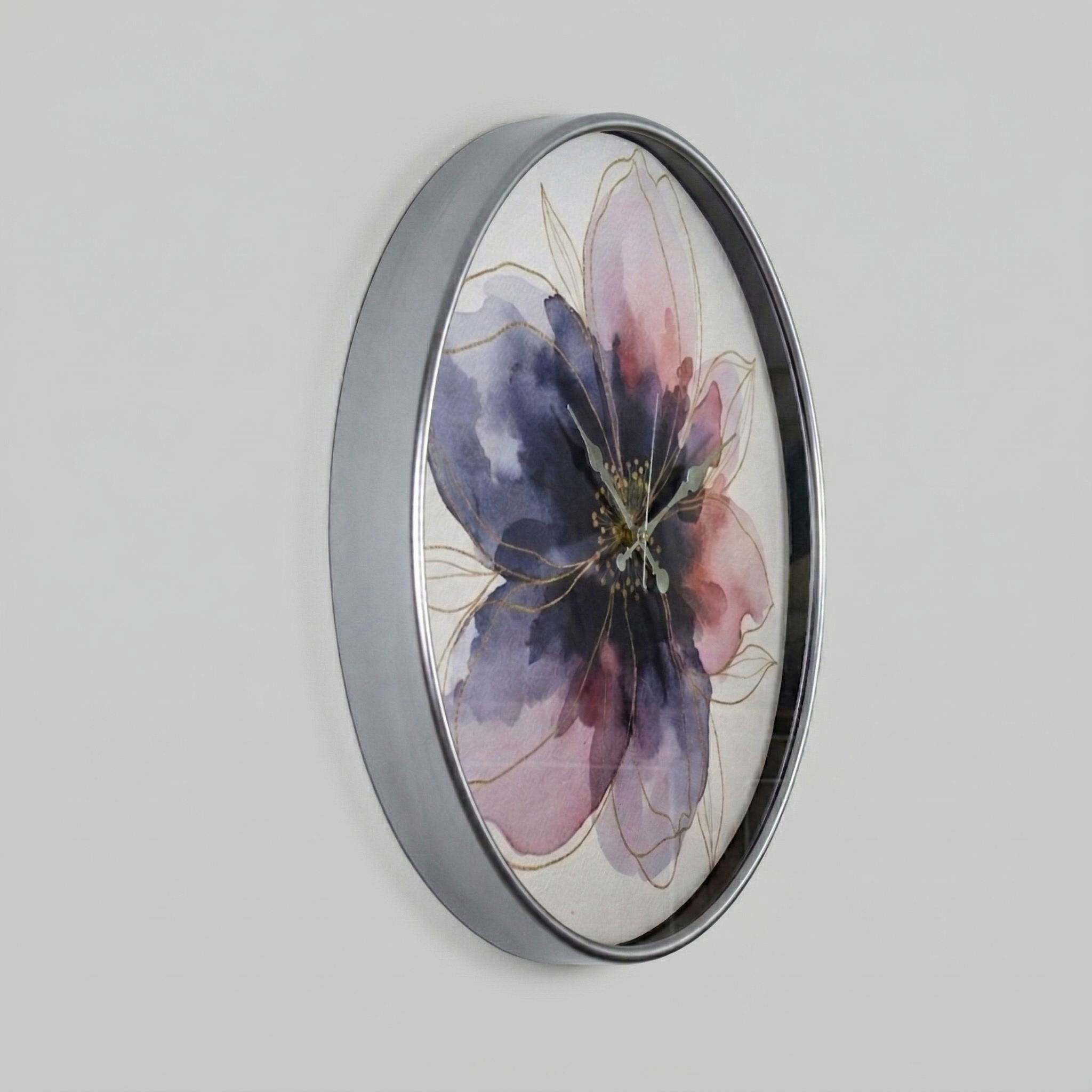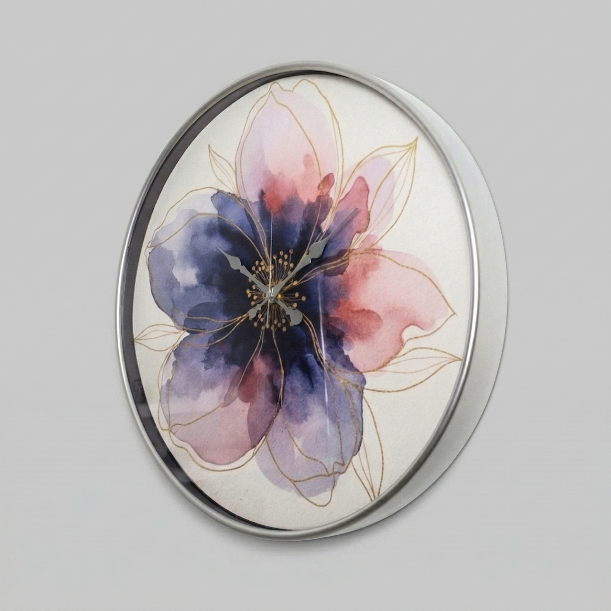 Gilded Clock | Large-Scale Art Series Centering on elegance and sophistication, the Gilded Clock by Loravien takes its name from the golden shimmering details on its petals. With its massive 50 cm diameter, watercolor-style floral texture, and protective glass surface, this model adds a romantic and luxurious touch to your living space.