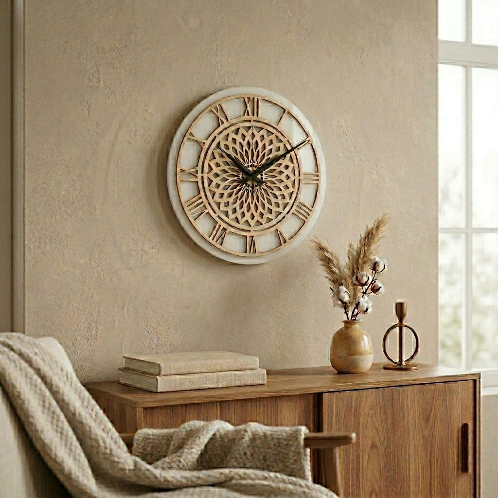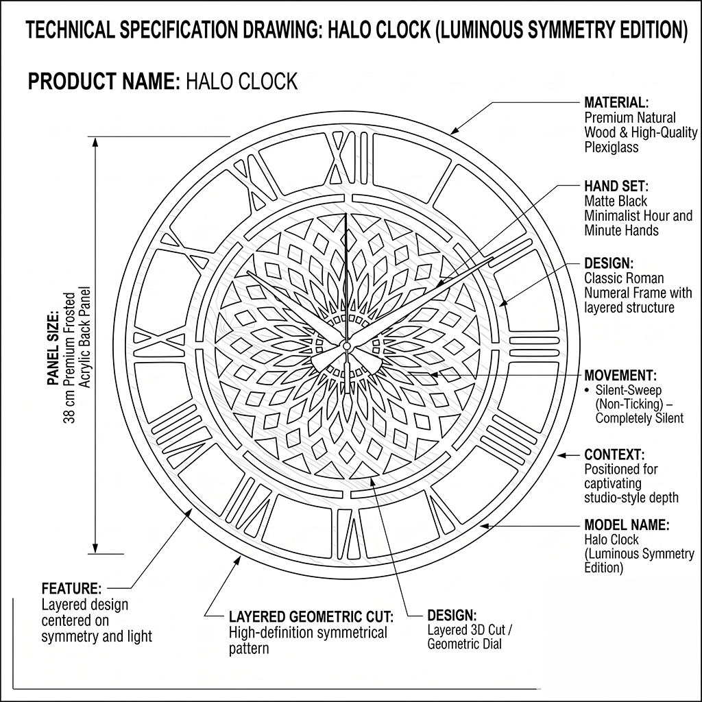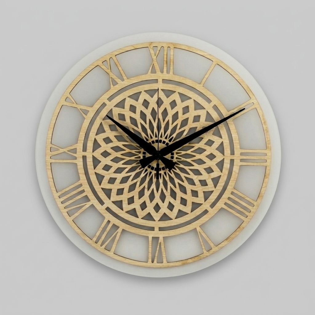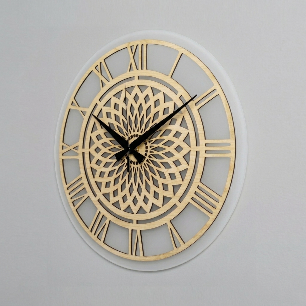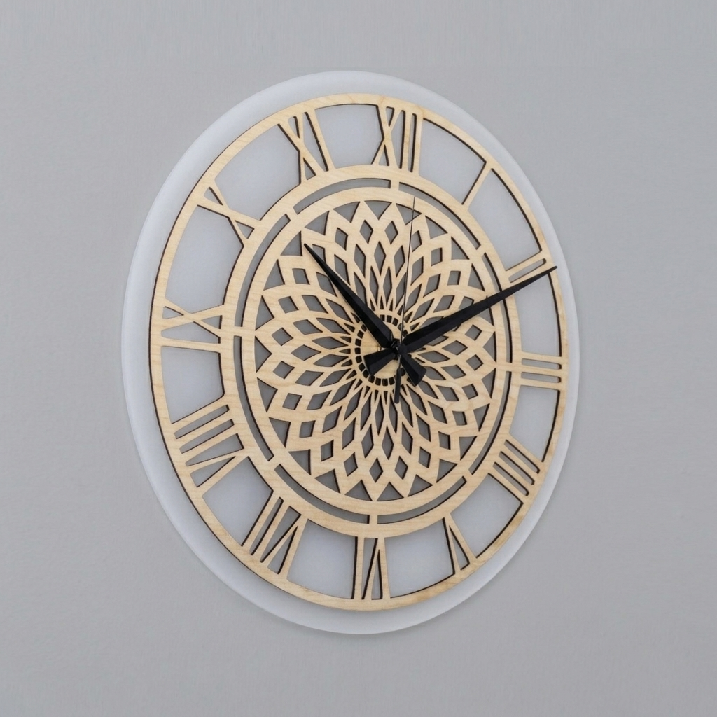 The 35 cm natural wood dial, positioned atop a 38 cm premium acrylic panel, combines with the classic elegance of Roman numerals to create a captivating studio-style depth on your wall.